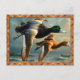 Featuring a breath taking view of two ducks flying over the ocean With a small boat below. And a island. This postcard has a wood floor brown frame.