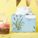 White ducks on a pond surrounded by bulrushes on a slightly patterned background.
