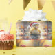 A fluffy duckling wearing a Santa hat floats serenely on a pond surrounded by water lilies
