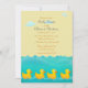 Bobbing in a pool of water, four little rubber ducks float in a row. An adorable design just perfect for a baby shower invitation.