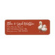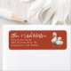Farm ducks return address labels. Two white ducks decorate rust orange color labels with white text. The first line is script for names or family name. The address space will hold three lines, as needed.