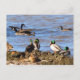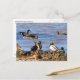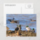 This postcard features an artistic rendering of a line of Mallard Ducks perched on the shore of Cayuga Lake watching Canada Geese swimming in the blue choppy water. One brave female duck has joined the geese. The male ducks can be identified by their iridescent green heads and yellow beaks. The females have lovely feathers in shades of brown and gold and orange beaks. Long black necks with one white stripe identify the geese.