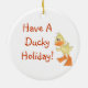 On one side is a cute little yellow duck on a pale yellow background. The background has lots of little ducks in various poses. The other side has a little duck with the words "Have A Ducky Holiday!"