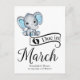 Adorable baby boy elephant with blue polka dot ears, "Due in March" typography, and template for special message announcing pregnancy.