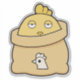 A bored yellow chicken sitting in a feed bag. Stuck? Yeah. Concerned? Not really.