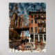 This DUMBO Brooklyn New York watercolor poster captures the world‑famous view of the Brooklyn Bridge framed by historic red‑brick warehouses on Washington Street. The artwork blends architectural precision with soft painterly texture, showing autumn foliage in warm reds, yellows, and oranges beneath a bright blue sky. Cars and pedestrians add authentic street energy while the bridge’s stone towers and sweeping cables create a dramatic focal point. Collection explores a unique stylistic interpretation — from classic watercolor to expressive mixed‑media — celebrating Brooklyn’s creative spirit and timeless urban charm.