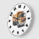 A dump truck is something in every city. This design is of a large dump truck. It is from the front and slightly side on. The truck is brown in colour. This dump truck design looks great on this clock. Perfect for yourself or as a gift