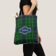 Colourful plaid tote bag done in the traditional blue, green, red, white and black clan Duncan tartan pattern. A decorative blue text plaque, on the front of the bag, has custom white text ready to personalise. Great all purpose tote.