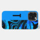 Cell phone case has a solid block of blue on one side and a swirl pattern in blue and black on the other side. Personalise with an initial, name or other text for a great gift idea. The name is in vertical orientation in black lettering.