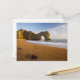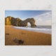 A postcard of the world famous Durdle Door natural rock arch near Lulworth Cover in Dorset, England. Empty beach and waves.