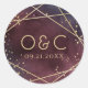 Glam faux gold glitter geometric lines and couples monogram on moody burgundy and navy blue watercolor background, Modern and chic, trendy wedding favour stickers for fall and winter wedding party.