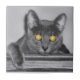 A photograph looking straight in the face of a grey cat with golden glowing eyes. Edited with selective colouring to emphasize the mesmerising eyes.