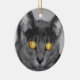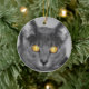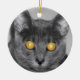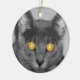 A photograph looking straight in the face of a grey cat with golden glowing eyes. Edited with selective colouring to emphasize the mesmerising eyes.