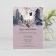 A stylish and elegant design on a dusky pink background featuring the silhouette of a lone owl flying across a watercolor night sky. A full moon in the background illuminates the fir trees in the forest landscape setting and highlights the delicate pastel pink foliage and soft pastel leaves and berries. The front has a woodland setting at night with a full moon displaying the bridal couples names. If you are getting married in winter, have a winter wonderland, rustic fall | autumn or forest woodland theme wedding then this illustration is perfect for your needs.