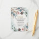 Design features elegant watercolor floral elements in shades of ivory, beige, blush pink, mauve, various shades of dusty blue and more. Design also features various types of greenery and branches with dusty blue watercolor splashes within the corners for added style.