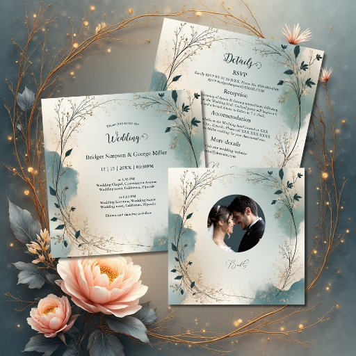 Dusty Blue Beige Boho Chic foliage wreath Wedding thank you photo card. Celebrate your special day with this exquisite Boho chic elegant modern wedding design. The design beautifully combines a soft dusty blue beige watercolor palette with a sophisticated botanical nature theme. The aesthetic is both simple minimal and charming, featuring a delicate wreath foliage border and subtle leaves glitter sparkle accents that catch the light. A lovely handwritten script is used for the names, adding a personal and romantic touch. This minimalist botanical leaves wedding invitation is the perfect choice for couples dreaming of an elegant, nature-inspired ceremony. As part of a customizable wedding collection, this AI-generated artwork allows couples to personalize it with their own names, text, and details, making every piece unique.
