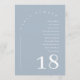 This simply elegant modern minimalist table number card features a simple serif font in an arch shape on a dusty blue background. You can personalise/customise the table number card and guests names to anything you like.
