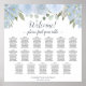 This elegant 17 table wedding seating chart boasts a rustic boho chic floral design, adorned with hand-painted watercolor roses and blossoms in shades of dusty blue along with sage green eucalyptus leaves and foliage. The title, "Welcome! Please find your table" is written in fancy script calligraphy, making it a visually pleasing and functional way to guide guests to their seats during the reception. The chart can accommodate a total of 170 guests with 10 seats per table and also features space for the couple's names and their wedding date. It serves as a wonderful way to greet guests and help them find their assigned tables during the reception.