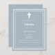 Dusty blue background, decorated with a white frame, and a white cross Personalise and add the name and details. White text.