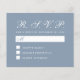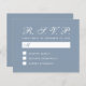 A simple, minimalist budget RSVP for a wedding. It has only white text on dusty blue background. The title RSVP and the letter M are written in an elegant calligraphic script, the rest in caps.