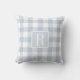 Custom-designed modern rustic throw pillow featuring personalised monogram on light dusty blue buffalo check pattern.