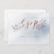 Elegant modern calligraphy wedding RSVP postcard with rustic floral design in copper brown colour on serenity dusty blue watercolor background, great for modern rustic wedding, spring wedding or winter wedding.