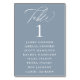 Elegant white calligraphy "table", with guest names listed and table number, wedding table number seating chart card. Background colour shown in dusty blue, can be customised.