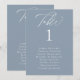 Elegant white calligraphy "Table" graphic, dusty blue wedding seating card.