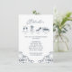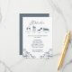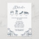 A dusty blue details card with a simple elegant blue damask scroll and calligraphy details. This enclosure Details card included a customisable timeline with cocktail glasses, silverware for dinner, a dancing shoe, and an old-fashioned car for Goodnight. This template can include wedding details and wedding information such as accommodation and wedding website.