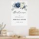 Dusty blue floral rehearsal dinner welcome poster featuring elegant bouquet of navy blue, royal blue , white , gold, champagne ivory, blush colour rose , ranunculus flower buds and sage green eucalyptus leaves and elegant watercolor bouquet. Please contact me for any help in customisation or if you need any other product with this design.
