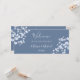 Wedding welcome reception seating chart with blue white cherry blossoms on a dusty blue background. A welcome text and your bride and groom names in an elegant handwritten font.