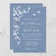 This dusty blue floral wedding invitation features cherry blossom branches on a dusty blue background. With bride and groom names in an elegant handwritten script.
