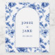 Personalise your reception wines with this dusty blue chinoiserie arched wedding bottle label, featuring delicate floral borders framing the couple's names and date in elegant serif text. The classic porcelainminspired design adds timeless sophistication to garden, coastal, or formal celebrations. Coordinates perfectly with blue floral stationery for cohesive "something blue" table accents.
