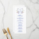 A refined and romantic wedding design featuring a dusty blue monogram crest framed by watercolor florals in pastel lavender, blush, and peach tones. The layout includes soft greenery, elegant serif and script typography, and a timeless format perfect for formal weddings.