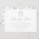 Dusty Blue Monogram Crest, wedding save the date. Vintage inspired Regency-Era baroque line art monogram crest. Features, an elegant dusty blue typography design style mix of script and bold type. Chinoiserie style garden floral pattern backing.