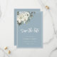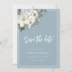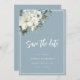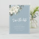 This elegant 'Save the Date' card features elegant typography and delicate watercolor flowers with green leaves on a classic dusty blue background. Personalize with your own details.