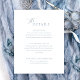 This dusty blue wedding details card offers a beautifully minimalist and elegant way to share important information with your guests. The clean layout, modern typography, and soft script accents create a refined, stylish look that complements any contemporary wedding suite. Perfect for reception directions, accommodations, and extra notes, it adds a polished finishing touch to your celebration stationery.