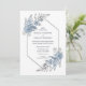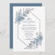 A dusty blue elegant wedding invitation featuring fern leaves and daisies held by a simple faux glitter wireframe. RSVP information has been included in this information for your guests to remind them to respond.