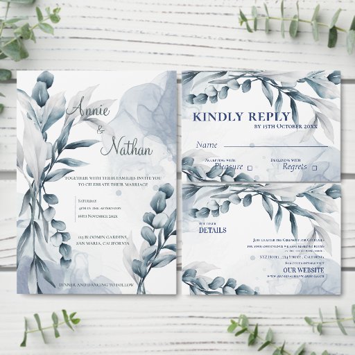 Chic Elegant Dusty Blue Eucalyptus Leaves Elegant Wedding Save the Date . Announce your special day in style with our "Dusty Blue Eucalyptus Leaves Elegant Wedding Save the Date" cards. Perfect for couples who love a blend of nature's elegance and modern sophistication, this design features delicate eucalyptus leaves in a soft, dusty blue hue. The subtle watercolor effect adds a touch of romance, while the clean, minimalist typography ensures your message stands out.