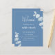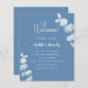 A modern, elegant, wedding program, timeline.  Dusty blue background, decorated with eucalyptus, sprigs. Personalise and add your names and wedding details.  If you have more text it's possible to reduce the line space and also add text on the back.