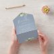 All in one dusty blue postponed wedding invitation featuring botanical greenery rustic leaves falling across a gold arch enclosing elegant typography. The invitation includes a perforated RSVP card with your wedding website QR code. Designed by Thisisnotme©