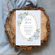 This simple and elegant wedding bridal shower invitation features romantic watercolor eucalyptus leaves and dusty blue roses and hydrangea flowers on a faux gold geometric centre frame and a light, dusty blue background.