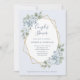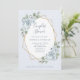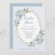 This simple and elegant couples wedding shower invitation features romantic watercolor eucalyptus leaves and dusty blue roses and hydrangea flowers on a faux gold geometric centre frame and a light, dusty blue background.