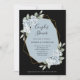 This simple and elegant couples wedding shower invitation features romantic watercolor eucalyptus leaves and dusty blue roses and hydrangea flowers on a faux gold geometric centre frame and a dark, black background.