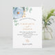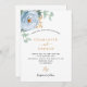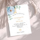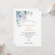 A chic white background. Decorated with a dusty blue floral, rose flower and green watercolored eucalyptus leaves, sprigs, greenery and a faux gold sprig. Personalise and add your names and wedding details. Black and golden coloured letters.