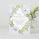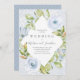 An elegant, vintage wedding invitation with a delicate blue arrangement of flowers and vines in a striking diamond geometric pattern. The border has a delicate white lace pattern atop a faint dusty blue background. The back of the card is designed with a diamond pattern to coordinate with the front.