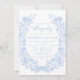 Immerse yourself in refined sophistication with this exquisite bohemian classic "Happily ever after" themed wedding invitations, showcasing graceful line art illustrations of blue flower blooms intricately forming a captivating wreath inspired by delicate lace. Ideal for adding an air of charm to your spring or summer celebration, this invitation embodies timeless elegance and delicate beauty.