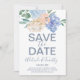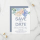 This dusty blue florals save the date card is perfect for a spring or summer wedding. The dainty design features light blue peonies arranged with peach and cream flowers in a gorgeous bouquet.