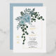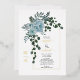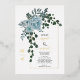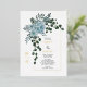 Dusty blue watercolor flowers, real gold foil arch and monogram spring wedding invitation. This lovely wedding design features a gold foil arch frame with dusty blue cactus flowers and leaves on the left corner and your monogram. The names are in script typography in gold foil.