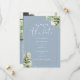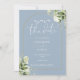 This elegant dusty blue botanical greenery leaves gold arch save the date invitation can be personalised with your information in chic typography with your special photo and wedding website QR code and details on the reverse. Designed by Thisisnotme©